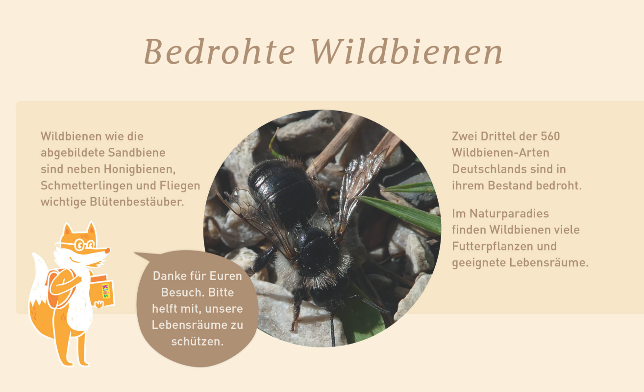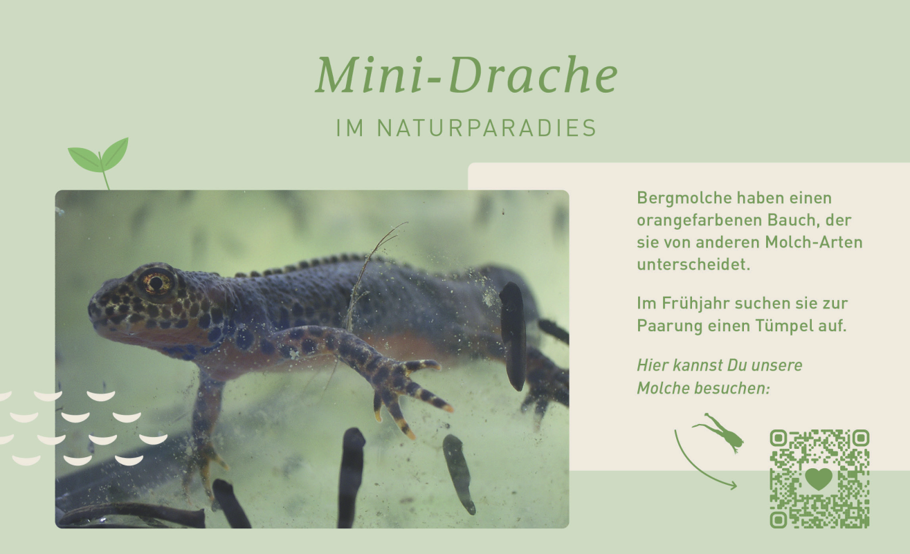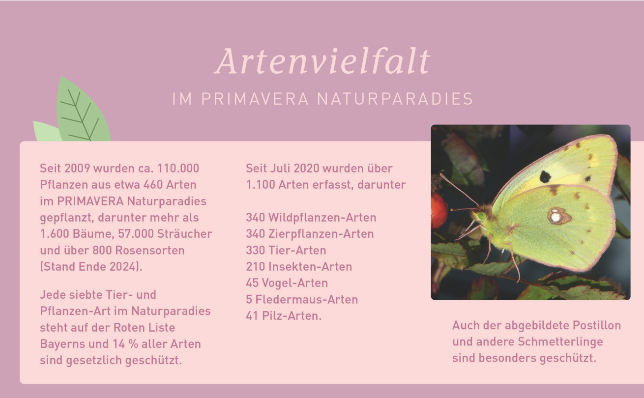 Konzeption des „Erlebniswegs Naturparadies“ für PRIMAVERA Life in Oy-Mittelberg bestehend aus fünf Säulen mit jeweils vier Quadern zu den Themen Biodiversität, Wasserleben, Amphibien, Erde und Luft. Besonderheiten sind die kindgerechten Inhalte der jeweils unteren Quader sowie die oberen, „sprechenden“ Quader mit integrierten Soundsystemen. Neben Geschichten mit Zorro, der Zauneidechse sowie Primo und Vera, den Turmfalken, gibt es unter anderem Vogelstimmen, Fledermausrufe sowie Gesänge von Heuschreckenmännchen zu hören.
